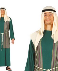 Este disfraz contiene una túnica verde con un chaleco incorporado a rayas, tocado color crudo y un cinturón estilo cuerda.