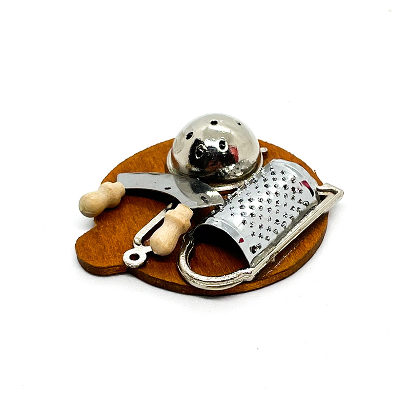 Tabla de madera con utensilios de cocina en miniatura.