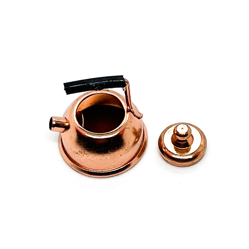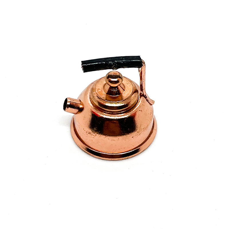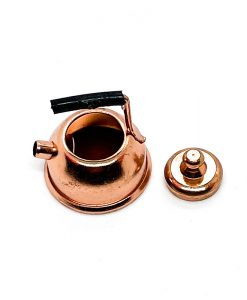 Preciosa miniatura de una tetera con tapa metálica.